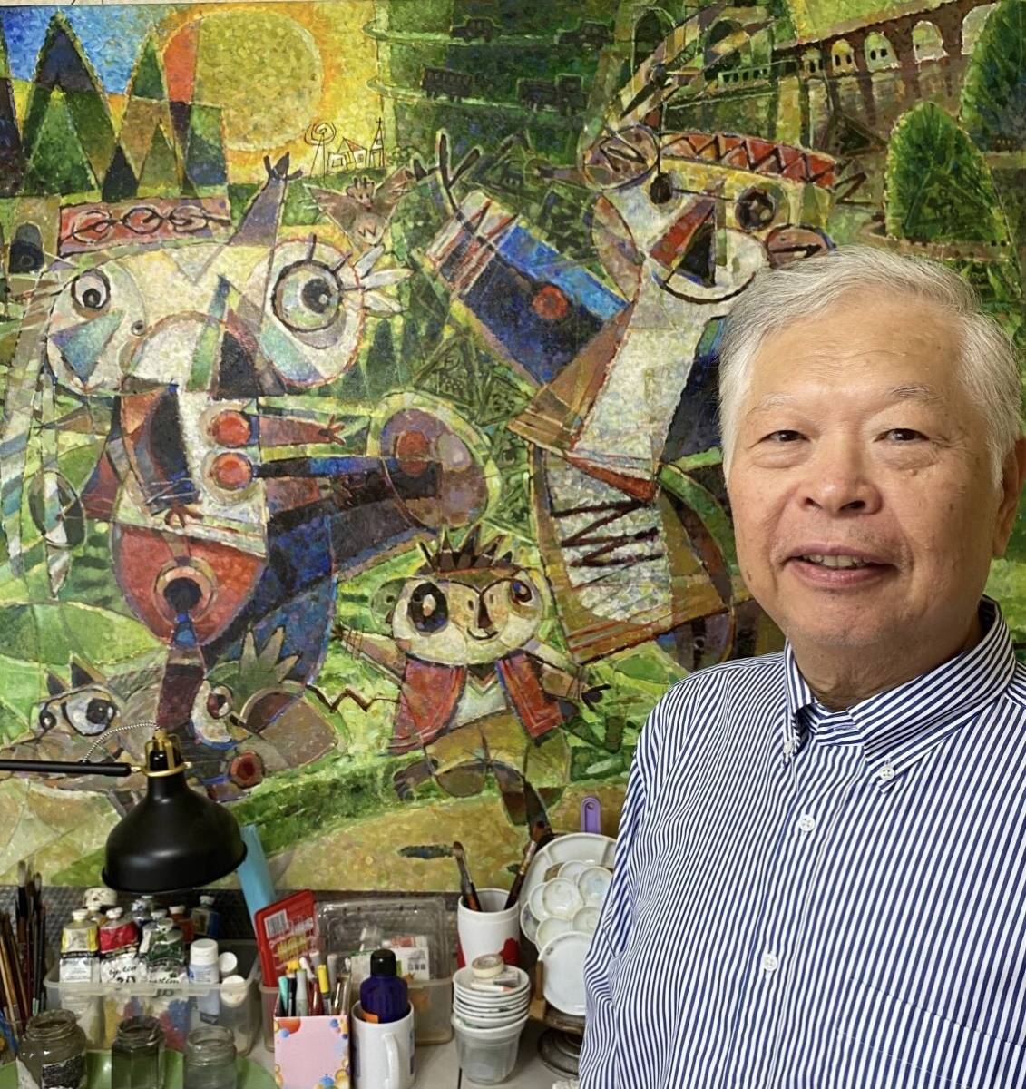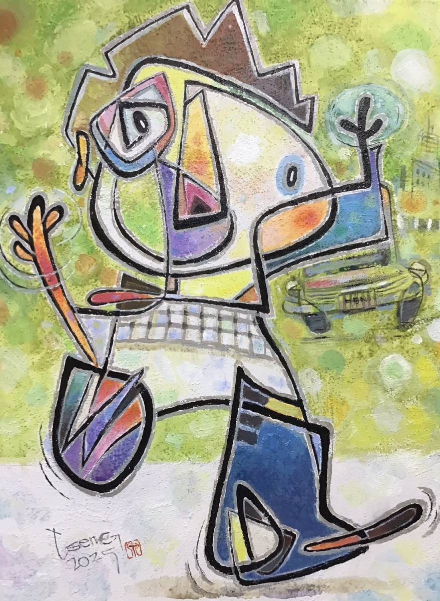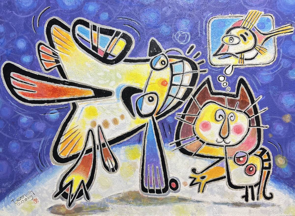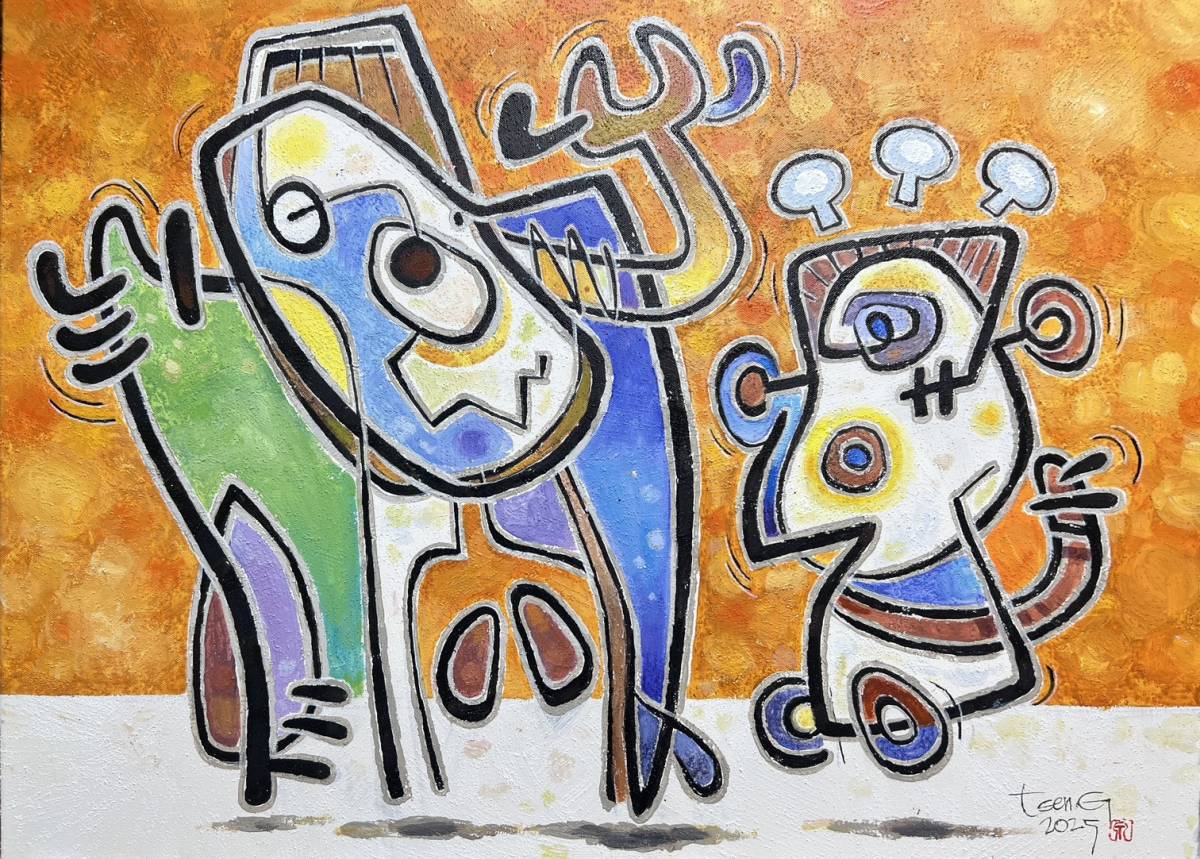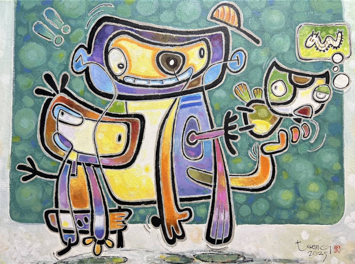 畫作擅長以書法線條融合色塊與幾何呈現幽默風趣的漫畫作品,若有似無的形體不難看出以動物或人交織而成,繽紛童趣的創作,看圖書說故事總令人會心一笑。
